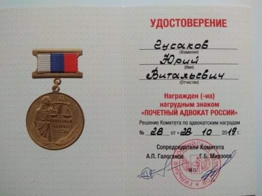 За существенный вклад в развитие адвокатуры Российской Федерации, профессиональные достижения адвоката, послужившие укреплению престижа адвокатского сообщества, за выдающиеся заслуги в деле защиты прав человека в Российской Федерации и за его пределами адвокат Гусаков Юрий Витальевич был награждён: