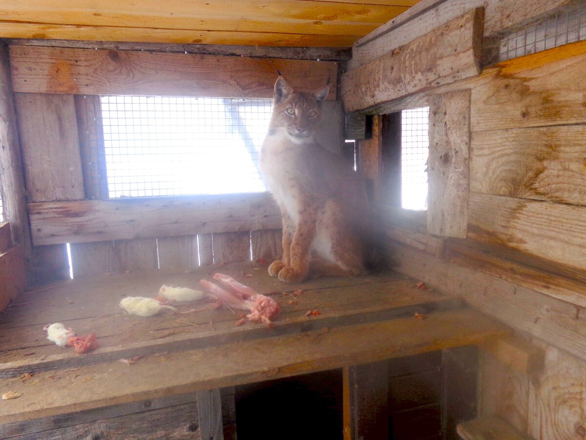 Переведенный в вольер Тимоха забрался в домик и наотрез отказался из него выходить. Да и не только выходить. Он вообще полностью отказался от еды и даже не пил. Собственно, то же самое происходило и с Рысом, которого нам привезли из Москвы, и с Лунхом, которого мы подарили в экопарк Беларуси. Они так же, как и Тимоха, находились в стрессе две недели. С другой стороны, эти коты попадали не только в незнакомое место, но и к чужим людям. А Тимоха-то был ручным котом!