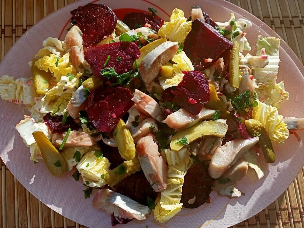 Сельдь лучше взять маринованную в пряном тузлуке , но подойдёт и просто малосольная. Лишь бы была вкусной сама по себе. Такая закуска красиво смотрится на праздничном столе и хороша в будни. КБЖУ 90/5/6/4 #игры Ингредиенты: -150 г Свёкла свежая, Чеснок, ч л Масло растительное, Кориандр молотый, черешок - 50 г Сельдерей, ст л Петрушка рубленая, Капуста пекинская, Филе сельди, Огурчики маринованные, Сметана, Творожный сыр, ч л Горчица, Перец чёрный молотый, Перец душистый молотый Способ приготовления: Сначала приготовим свёклу. Её нужно нарезать тонкими ломтиками. Смешать с кориандром, маслом и мелко нарубленным зубчиком чеснока. Запечь в духовке при температуре 180 ⁰с минут 15-20 до мягкости или в микроволновке 5 минут при мощности 800 ВТ в какой - нибудь подходящей ёмкости. Остудить. Пока готовится свёкла, подготавливаем филе сельди, нарезаем её полосками. Половину огурчиков нарезаем мелкими кубиками, остальные полосками, как и сельдь. Сельдерей мелко рубим. Второй зубчик чеснока можно