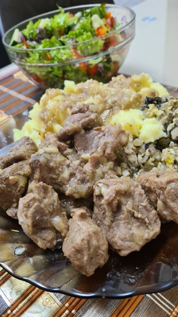 Мясо получается сочным, нежным. Оно в буквальном смысле тает во рту. Подходит к любому гарниру. У меня в это раз пюре, салат и жареные грибы. Ингредиенты: Свинина, Лук репчатый, Чеснок, Соль, Перец чёрный Способ приготовления: Мясо Нарежьте средними кусочками. Отправьте в кастрюлю или сковороду вок и томите под крышкой на медленном огне. Мясо пустит воду, добавьте соль и перец. Перемешайте, добавьте лавровый лист. Продолжайте тушить на медленном огне под крышкой. Лук нарежьте четверть кольцами. Измельчите чеснок. Когда вода уменьшится на половину добавьте лук и чеснок. Перемешайте. Продолжайте тушить пока воды останется совсем немного. Всего времени уходит примерно часа два. Томленое мясо готово. Всем приятного аппетита.