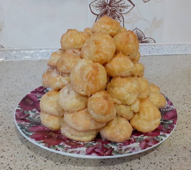 Крокембуш - французский #десерт состоящий из заварных пирожных. Торт по этому рецепту получается очень красивым и изысканным Ингредиенты: Тесто:, Вода, Яйцо, Мука, Сливочное масло, Начинка, Творожный сыр , Сгущенка, Карамель, Сахар , Вода Способ приготовления: Наливаем 2 стакана воды в кастрюлю и ставим на огонь. Добавляю масло в воду. Доводим до кипения. Яйца разбиваем и слегка перемешиваем венчиком. Постепенно вводим яйца в заварное тесто, перемешивая до однородности. Частями ввести муку, мешая все ингредиенты лопаткой. Готовое тесто переложить в мешок, завязать. Противень застилаем бумагой для выпечки и отсаживаем тесто. Выпекаем при температуре 190 градусов 30 минут. Ля крема смешиваем творожный сыр и сгущенку. Остывшие профитроли наполнить кремом. Для варки карамели высыпаем сахар с водой в выбранную кастрюлю, тщательно перемешиваем, ставим на плиту на средний огонь. Ждем когда сахар начнет плавиться, при этом не перемешиваем. Когда большая часть расплавится, можно начать медленно