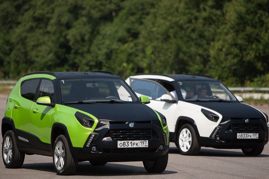 Через полгода на выставке в Москве были представлены первые опытные образцы – е-микровэн, е-фургон и е-кросс-купе. Они еще не могли ездить, были установлены на стальных рамах, имели немецкий двухцилиндровый двигатель.