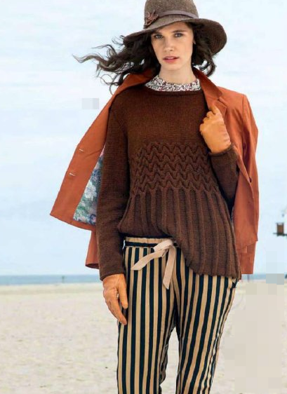 Недавно я делилась впечатлением от того, как "подают" свои модели потенциальным покупателям интернет-магазины, их продающие и журналы мод, их создающие. Огромным, и едва ли не единственным, плюсом журнала остаётся возможность взять спицы и повторить модель по описанию. И хотя многие пишут, что перепечатанные описания из журналов — штука скучная и "мы этого не делаем", некоторые интересные штуки я нахожу именно в них). Сегодня пролистала журнал "Verena подиум", отметила несколько интересных (на мой взгляд, конечно!) моделей, и хочу поделиться с вами их описанием. Модель первая: Пуловер с баской Как выглядит Модель связана снизу вверх: баска так называемым "ребристым узором", следом идёт зигзагообразный узор, и кокетка переда и спинки, а также рукава, выполнены лицевой гладью. Рукав втачной. Пуловер выглядит универсальным — его можно связать и тёплым, и лёгким разноцветным летним. Фасон может скрыть недостатки фигуры и многим подойдёт. Попробуем немного увеличить фото, чтобы понять, как