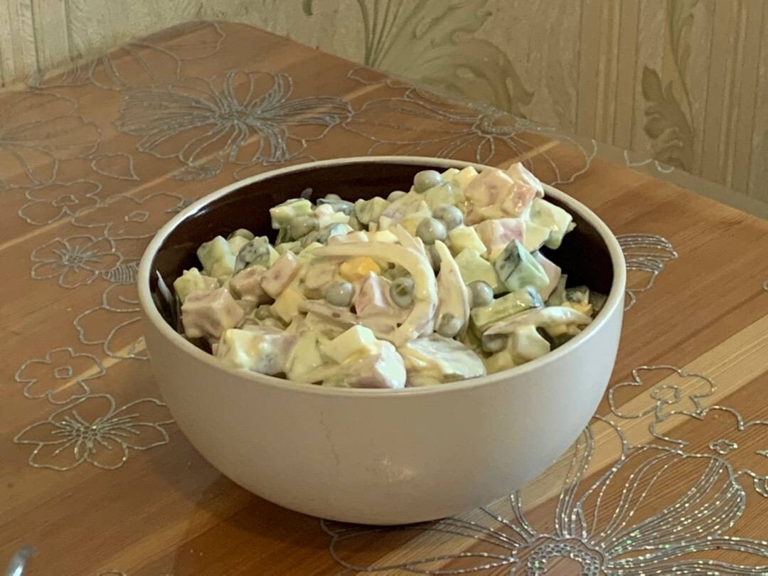 Ингредиенты: ветчины, огурца, яйца, зелёного горошка, лука, сметаны, соль