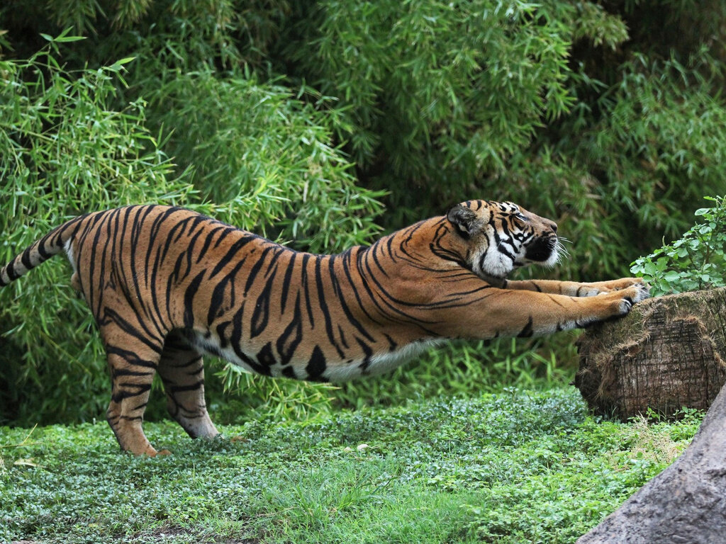 У каждого тигра полосы уникальны так же, как у человека отпечатки пальцев. Когда тигры преследуют свою добычу, обычно при недостаточном освещении во время сумерек или на рассвета, они почти невидимы. Независимо от того, проживают ли они на лугах, в лесах или джунглях, у диких тигров имеется тёмно-оранжевый окрас с тёмными полосами. Так как же такое ярко окрашенное животное может настолько хорошо прятаться, находясь на охоте? Ответ: камуфляж! Поскольку тигры — высшие хищники, располагающиеся на вершине пищевой цепи, им не нужно прятаться от животных, которые могли бы их съесть. Они плотоядные животные — едят мясо — и для успешной охоты эти звери полагаются на скрытность. В охоте же им часто помогает ограниченное зрительное восприятие их любимой добычи. Олени и другие копытные животные не могут видеть весь спектр цветов, как человек с дальтонизмом. Это помогает им лучше видеть при тусклом свете, однако, в свою очередь, также делает их уязвимыми. В их глазах мех тигра не ярко-оранжевый: