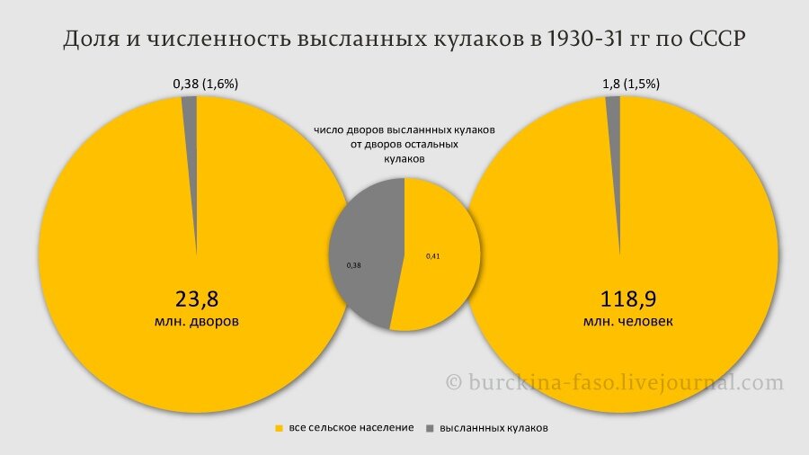 Старое наблюдение – сейчас появилось очень много людей, утверждающих, что их предков раскулачили. Между тем все «секретные» цифры давно известны. Раскулачено и выселено было 1,8 миллионов человек, из них несколько сот тысяч - в отдаленные районы страны. Это и кулаки, и члены их семей. Реальный процент можно увидеть на картинке.