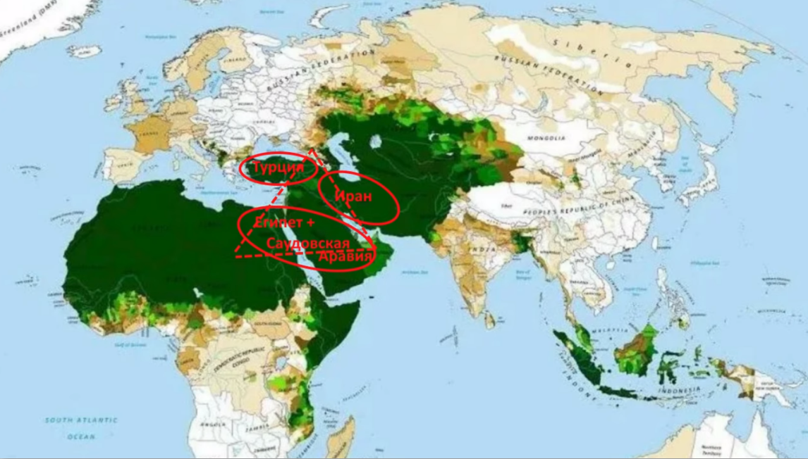 В интересах Москвы создать такой новый мир на Ближнем Востоке, который бы уравновесил три сформировавшихся там места силы. Турецкий (Османский) мир, Арабский мир и Иранский мир. Все они должны развиваться примерно одинаково и уравновешивать друг друга. И соответственно задача американцев и европейцев, сломать эту конструкцию и чтобы войны там внутри не заканчивались вечно. И пока не разрешится самая главная схватка, между Россией и Китаем против США и Великобританией, пожар в этом регионе не закончится. Что за три места силы в исламских странах, что это за три главных геополитических игрока на мусульманской карте мира. Первое место, это турецкий проект. Турция пытается восстановить неоосманский мир и здесь сталкивается с арабским проектом, потому что значительное количество стран, которые входили в османскую империю, это арабские страны, у которых со временем появился свой проект и лидером этого проекта является Саудовская Аравия и Египет. У саудитов хватает денег, чтобы быть главными,