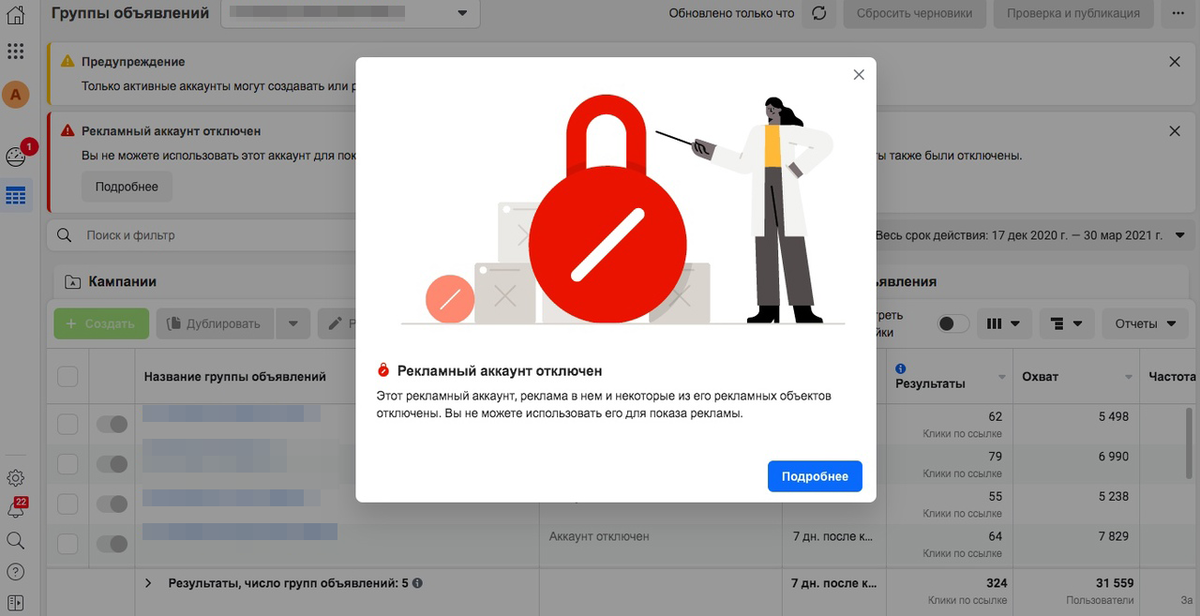 1. Разблокировать кабинет или просто запустить рекламу. Что угодно. Лишь бы запустить.