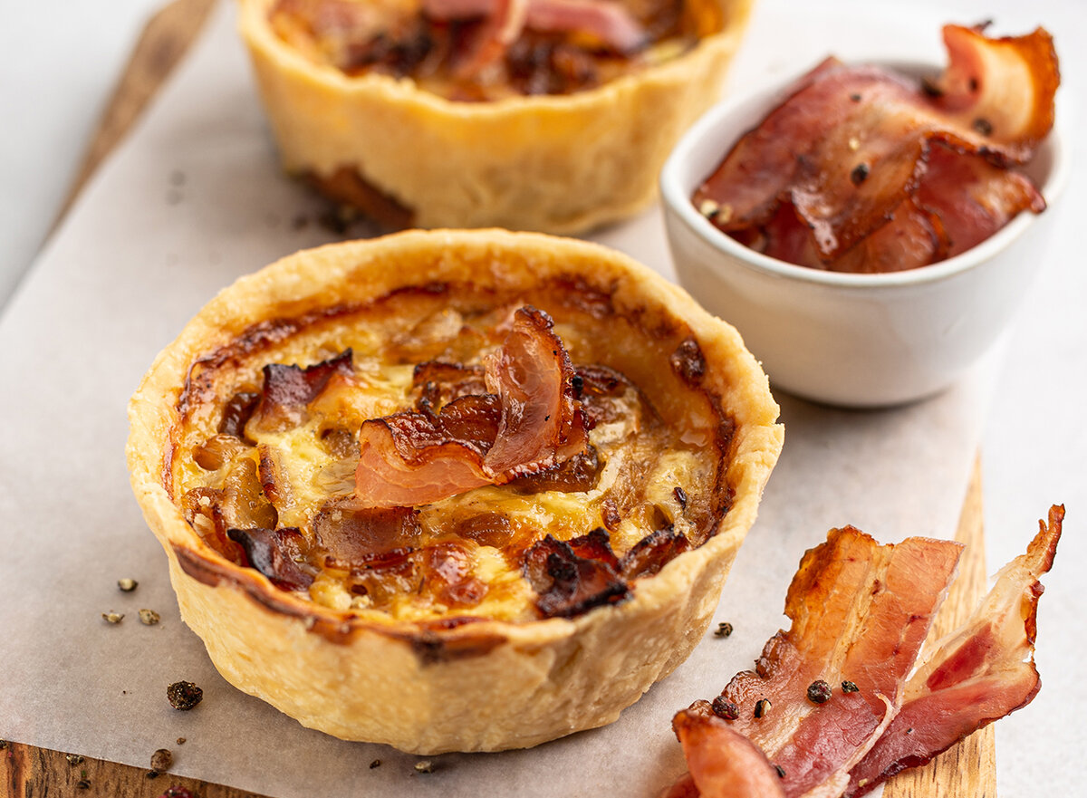 Пока тесто охлаждается, готовим начинку и заливку. Для начинки обжариваем лук, нарезанный крупными полукольцами, на сливочном масле до мягкости. Добавляем нарезанный сырокопченый бекон, солим, перчим и еще немного обжариваем.