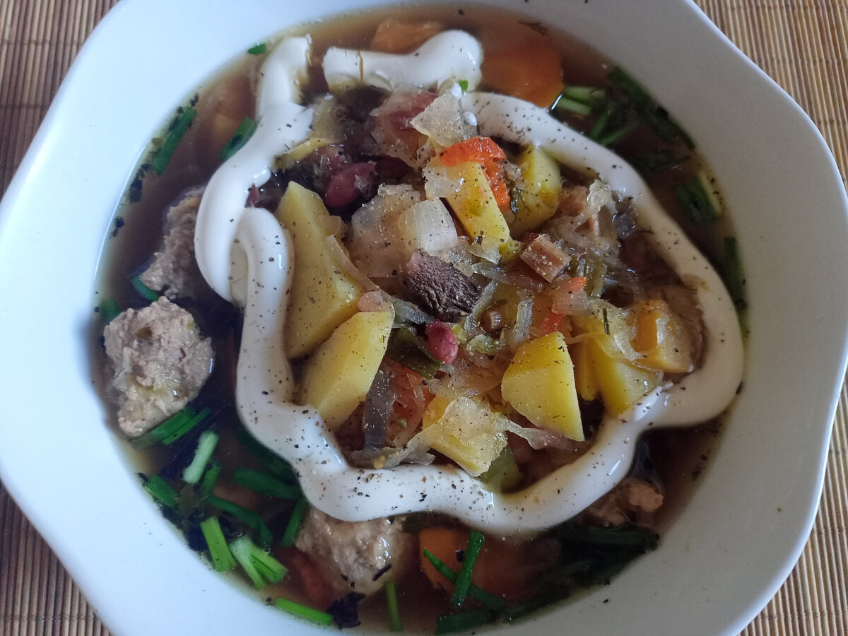Фрикадельковый суп подаётся в тарелки для первых блюд.