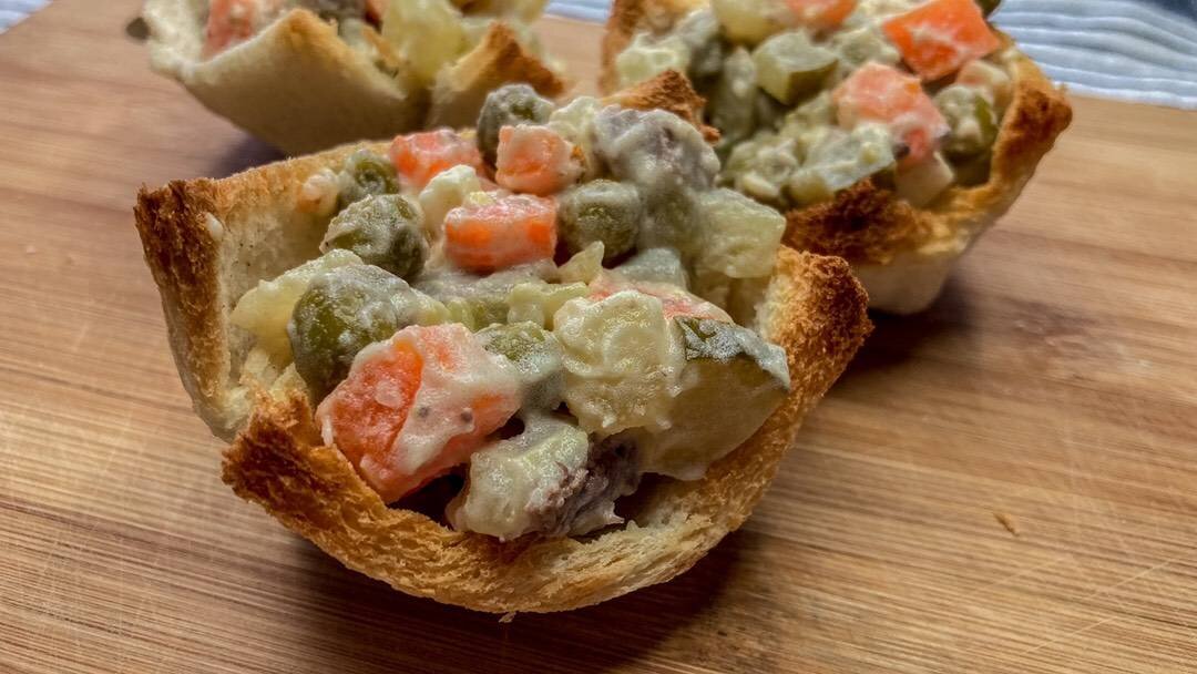 Ну какой же Новогодний стол без Оливье, но приготовим его с изюминкой. Вместо колбасы добавим говядину, а подавать будем в качестве закуски. #салат #новогоднийстол #закуска #игры Ингредиенты: говядины, картофеля, моркови, яиц, соленый огурцов, горошка, соль и перец, майонез/сметана, хлеб для тостов Способ приготовления: Говядину отвариваем в подсоленной воде около 2 часов. Охлаждаем и нарезаем кубиком. Картофель, морковь и яйца отвариваем, охлаждаем и нарезаем кубиком. Таким же кубиком нарезаем огурцы и добавляем зелёный горошек. Смешиваем все ингредиенты, добавляем соль и перец, и заправляем майонезом. У хлеба срезаем корочки и перекладываем в выпуклую форму для запекания кексов, так чтобы получилась бабочка из хлеба. Ставим в разогретую духовку до 180° на 7-10 минут. Перекладываем салат в корзинку и подаём к столу.