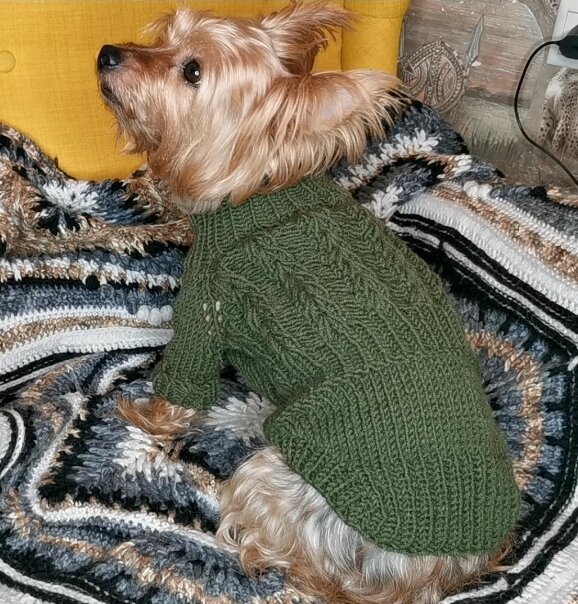 Всего один вечер и один моточек пряжи. Вяжется быстро и легко . Делаем необходимые замеры . В идеале вообще примерять на питомца по мере вязания Я начинаю с шеи и далее вяжу одним полотном МАТЕРИАЛЫ УЗОР Резинка -колосок (видео МК) УСЛОВНЫЕ ОБОЗНАЧЕНИЯ Л. П.-лицевые петли И. П.-изнаночные петли Р. П.-регланная петля ОПИСАНИЕ Набрать на спицы 3.5 итальянским набором 49п.+1 для замыкания в круг . Провязать 2 ряда полой резинкой , сменить на спицы 4 и замкнуть вязание в круг . Вяжем на круговых спицах резинкой 1х1 примерно 5-8см . Делим вязание на 3 части :перед , спинка и рукава У меня 50п . 50делим на 3. Выходит по 16п. на каждую часть с запасом . на рукава для ровности отводим по 5п.=10п Остается 40п.на спинку и перед Пополам это по 20п. Т.к. у собаки лапы находятся не сбоку как у человека, а спереди под туловищем. На перед мы отложим меньше петель , чем на спинку . Так же я вяжу свитер на Йорка, а спина у них значительно шире груди. И по одной петле по бокам от рукаво