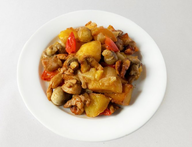 Простой рецепт сытного блюда. Ингредиенты: Как готовить: 1. Картофель вымыть, почистить и нарезать крупно. 2. Перец или помидор также разрезать на несколько частей. Если готовите из перца, то семена убрать обязательно. 3. Куриное бедро разрубить на кусочки помельче, приправить пряностями и слегка обжарить на растительном масле. Не до готовности. 4. Шампиньоны разрезать на четвертинки. Репчатый лук порезать полукольцами. 5. В большой миске соединить картошку, курицу, грибы, помидор или перец. Добавить лук, соль, перец, майонез и сок с цедрой половины лимона. Можно приправить любыми пряностями по желанию. А также использовать вместо курицы копченые колбаски, будет совсем в охотничьем стиле. А вот горошек или кукурузу добавлять сюда не желательно. Все содержимое миски хорошенько перемешать, оставить минут на 30 промариноваться под крышкой. Затем еще раз смешать все и поместить в пакет или рукав для запекания. Завязать концы, выложить в форму или противень, сделать пару проколов сверху для
