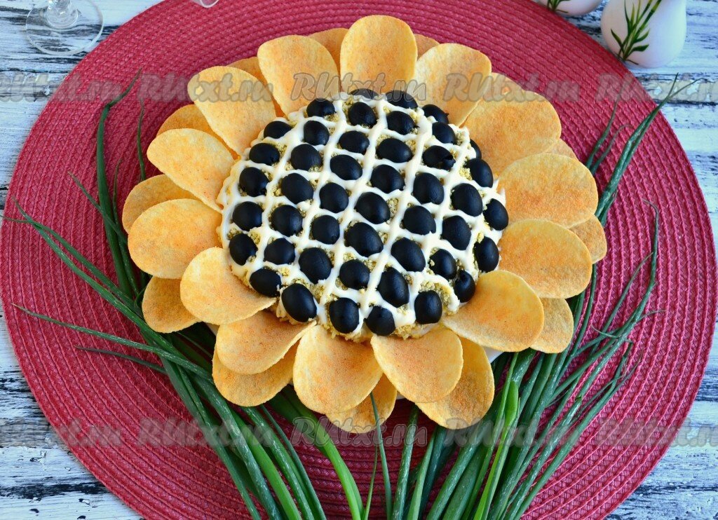 Для приготовления салата "Подсолнух" с курицей, грибами и чипсами понадобится: шампиньоны свежие - 150 г; растительное масло - 2 ст. л.; лук - 0,5-1 шт.; соль, перец черный свежемолотый - по вкусу; куриное отварное мясо - 200 г; яйцо вареное - 2 шт.; шампиньоны маринованные - 100 г; сыр твердый - 80 г; черные оливки без косточек - 0,5 банки; майонез - по вкусу; чипсы картофельные типа "Pringles" - Свежие шампиньоны нарезать средними кусочками или пластинами, выложить в сковороду с растительным маслом и обжарить на среднем огне 2-3 минуты. небольшую тарелку первым слоем выложить охлажденное и нарезанное отварное куриное мясо (можно использовать грудку или мясо с ножек и бедрышек, предварительно отварив около 40-45 минут в подсоленной кипящей воде). Мясо чуть поперчить, нанести сеточку из майонеза. Добавить к грибам очищенный и нарезанный средними кусочками репчатый лук, посолить и поперчить, обжаривать, помешивая, около 5-7 минут, затем остудить. итоге не должна быть мелкая крошка, как