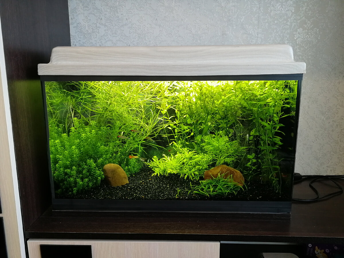 Переставил сегодня аквариум на новую тумбу. Слил всю воду, выловил основных крупных рыбок. И заодно подрезал разросшуюся травку. Рыбки и растения после переезда чувствуют себя хорошо. Вода за несколько часов почистилась так что пока всё отлично. На новом месте аквариум смотрится красивее его лучше видно с разных сторон теперь.