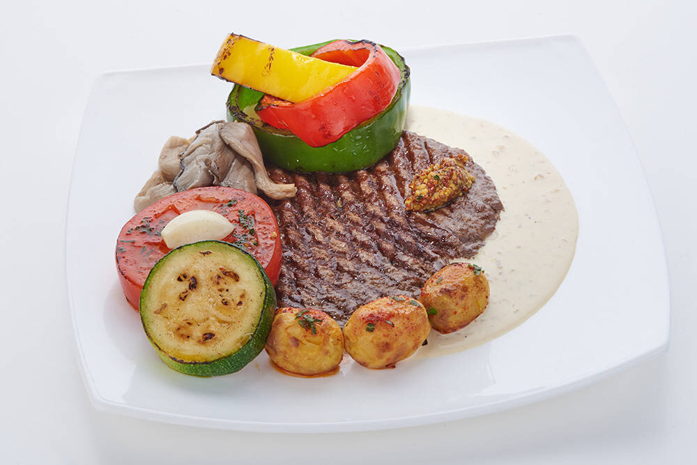 Бифштекс-гриль на мексиканском перечном соусе, с запечёнными овощами выдержанными в тыквенном масле!