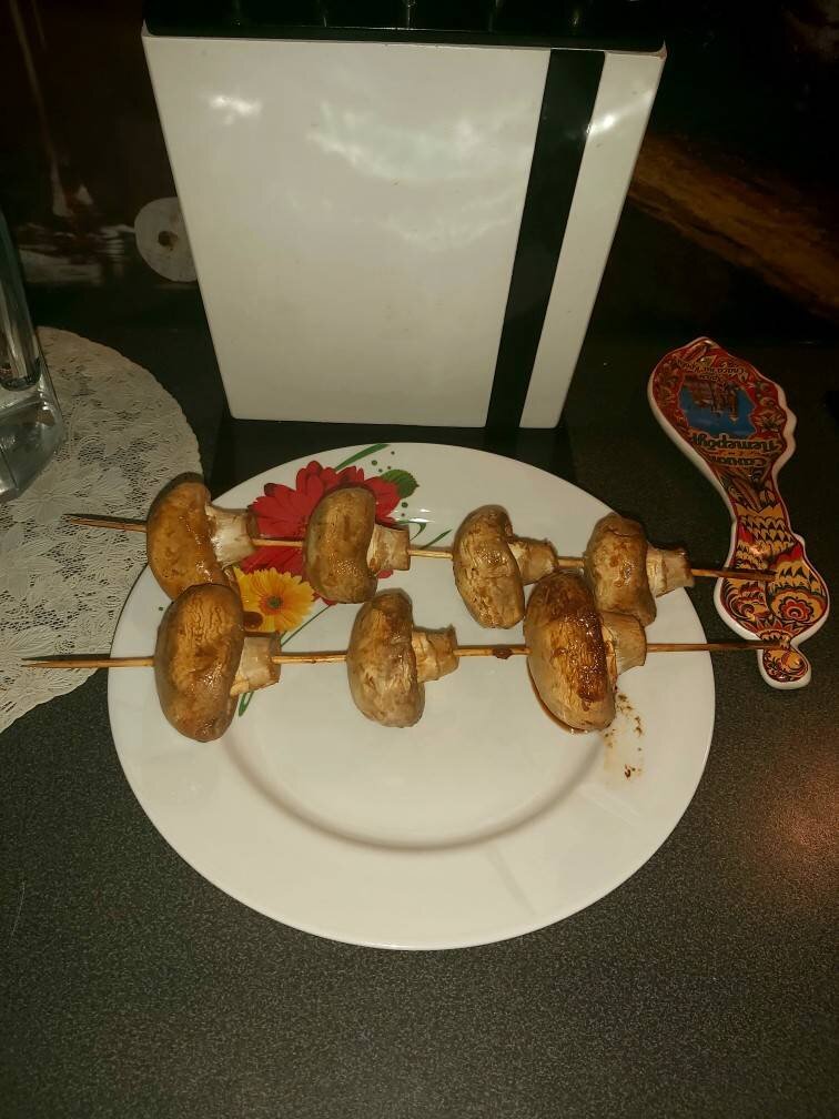 Всем доброго времени суток! Если любите шампиньоны - смело забирайте мой рецепт в закладки! Ингредиенты: шампиньонов, соевого соуса, меда, паприка Способ приготовления: Шампиньоны хорошо помыть, положить в глубокую миску. Жидкий мед (или предварительно растопленный) соединить с соевым соусом, добавить паприкой, перемешать. Полить смесью шампиньоны, перемешать. Дать помариноваться минут 30. За это время шампиньоны нужно несколько раз перемешать. Шампурчики предварительно вымочить в воде. Нанизать грибы на шампурчики, выложить на решётку гриль, а под низ поставить противень с водой. Запекать в духовке 25 минут при температуре 200 градусов. Приятного аппетита! 🤤 Если есть вопросы по приготовлению - я на связи: пишите мне, всегда рада помочь!😉