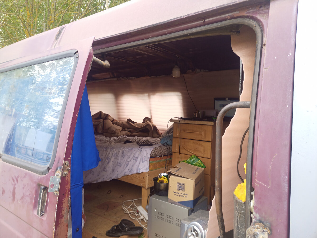 Жизнь в автодоме без мотора продолжается. Проживаю в машине в которой нет двигателя моста. коробки передач. Попав в нелегкую ситуацию оказавшись без дома, начинаю жизнь с нуля в свои за 50. Трезвая жизнь без сигарет и алкоголя идет и этот процесс пока еще не прервался, стараюсь как то выкручиваться, приходится ночевать вот в таких условиях, на носу зима и в скором времени уже что то нужно будет предпринимать в конкретную сторону. Спать в таких условиях очень сложно, если кто не пробовал пожить в железном фургоне, скажу так. Ночью в двойне в нем холоднее а днем в двойне жарче. Иногда ночую в гамаке на улице, свежий воздух и наличие звезд наталкивают на различные позитивные мысли. Мечта о своем автодоме не покидает, но для того чтоб она сбылась нужно потрудиться, и раз жизнь начинается с начало. Нужно все равно какое то жилье, где по крайней мере не будет собираться конденсат, да и зима не за горами. Наличие земельного участка, куда с весны успел провести электричество, сдела