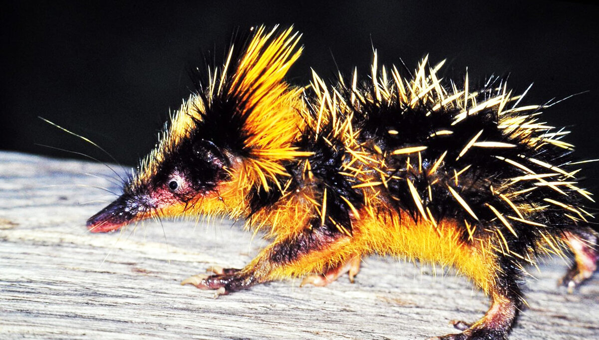Давным-давно, 30 млн лет назад, тенреки оказались изолированными на отколовшемся от Африки Мадагаскаре. Поэтому зверьки до сих пор сохранили такой пикантный облик: желто-черные полосы по телу, на затылке, спине и по бокам несколько иголок. На шее их больше, когда они поднимаются, то образуют колючую гриву. На самом деле это даже не твердые иголки, а щетины. В длину тенреки достигают 16 см, самые крупные из них весят 280 г.