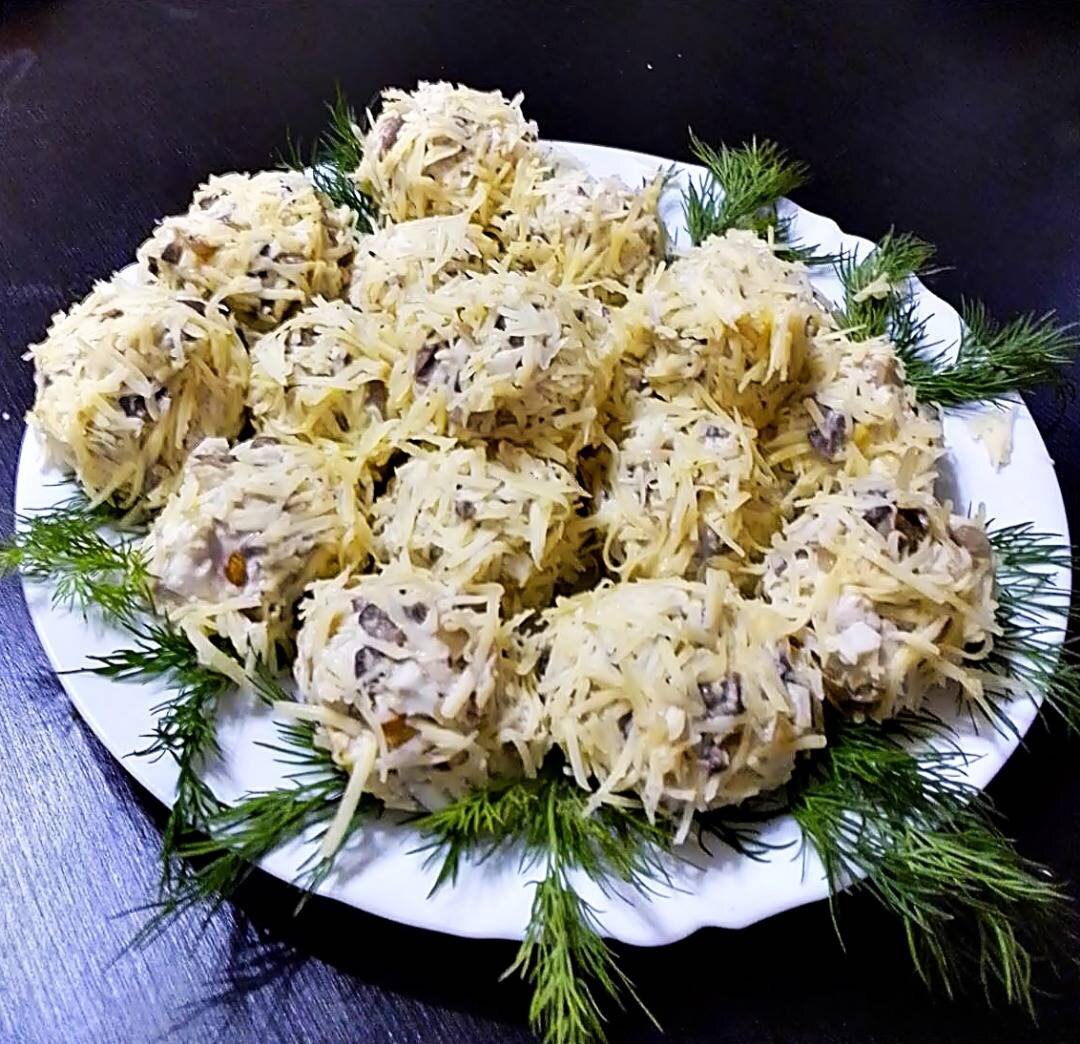 По мотивам закуски "Рафаэлки". Ингредиенты: куриной грудки , шампиньонов, луковица, сыра, очищеных грецких орехов, майонеза, чеснока (не обязательно), растительного масла Способ приготовления: Куриную грудку мелко порезать, обжарить на растительном масле, добавить порезанный лук, затем порезанные шампиньоны. Немного посолить, обжарить до начала зарумянивания лука. Выложить смесь на бумажное полотенце, чтобы слегка удалить жир. Переложить в миску, добавить майонез, перемешать. Натереть сыр на крупной терке. Из курино-грибной смеси сформировать шарик размером с грецкий орех, внутрь этого шарика положить 1\4 ядра того же ореха, полученный шарик обвалять в натёртом сыре. Готовую закуску выложить на блюдо, убрать в холодильник на 20-30 минут. При подаче украсить на своё усмотрение. Приятного.... ПЫ. СЫ. В курино-грибную смесь можно добавить натёртый на тёрке чеснок.