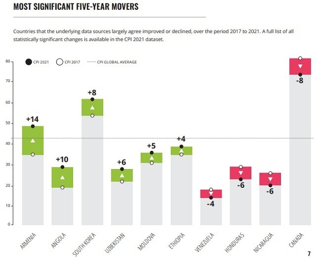 Всегда можно почерпнуть массу полезной информации из сообщений любого источника. Организация Transparency International (российское представительство организации признано Минюстом РФ иностранным агентом) опубликовало интересный доклад об уровне восприятия коррупции в отдельных странах. Поскольку доклад является ежегодным, то можно посмотреть изменения, которые происходят в различных странах. Методика, конечно, может быть подвергнута любой критике, но поскольку иного не дано, будем исходить из полученных оценок (ну или не будем, кто как захочет). Все страны получают определенные баллы за продвижение к светлому безкоррупционному будущему и баллы могут достичь 100. Это тот уровень, когда коррупции в принципе нет. Данные агентом собраны из 13 источников в 12 организациях. По результатам страны расположились в определенном порядке. Лучшая тройка - Новая Зеландия, Дания, Финляндия - по 88 баллов. На последнем месте Южный Судан – 11 баллов. Здесь необходимо сделать отступление, что 88 балло