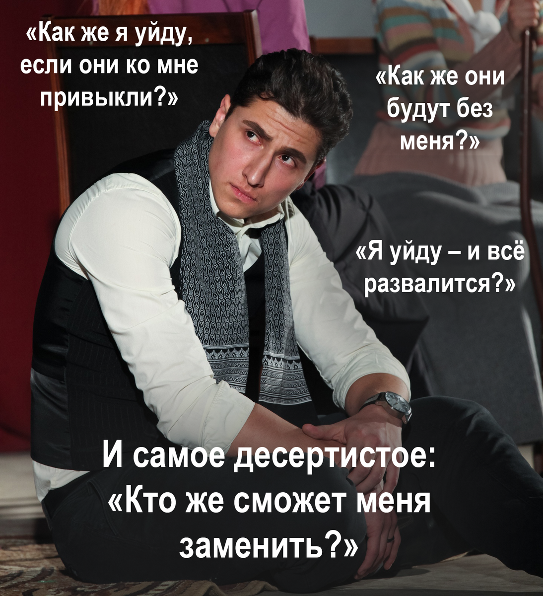 Эх… как же часто мы это делаем, как же свойственно нам перекладывать вину в наших бедах на других, прикрывая собственную несостоятельность красивыми словами «ответственность», «идейность», «человеколюбие» и пр. «Как же я уйду из этого коллектива, если столько людей в нём нуждаются?» Хорошо, в чём они нуждаются, ты знаешь. А в чём нуждаешься ты? Что из этого ты можешь получить, оставаясь в этих предлагаемых обстоятельствах? Вот что хотите со мной делайте, но я не верю человеку, если он говорит: «как же я уйду, если они ко мне привыкли?», «как же они будут без меня?», «я уйду – и всё развалится?» или самое десертистое «кто же сможет меня заменить?» Ох…