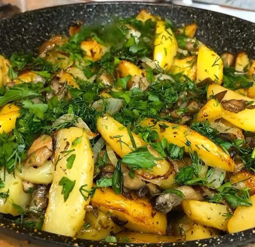 Нарезаем грибы и обжариваем до золотистого цвета. Далее вынимаем их и нарезаем картошку, мельчить не нужно. Картофель нужно обжарить до золотистой корочке. Следом к картошке нарезаем полукольцами лук и отправляем в сковороду. Далее засыпаем грибы к картошке. Посыпаем солью и перцем по вкусу, и даём постоять под крышкой на слабом огне 5 минут. Тем временем готовим соус.