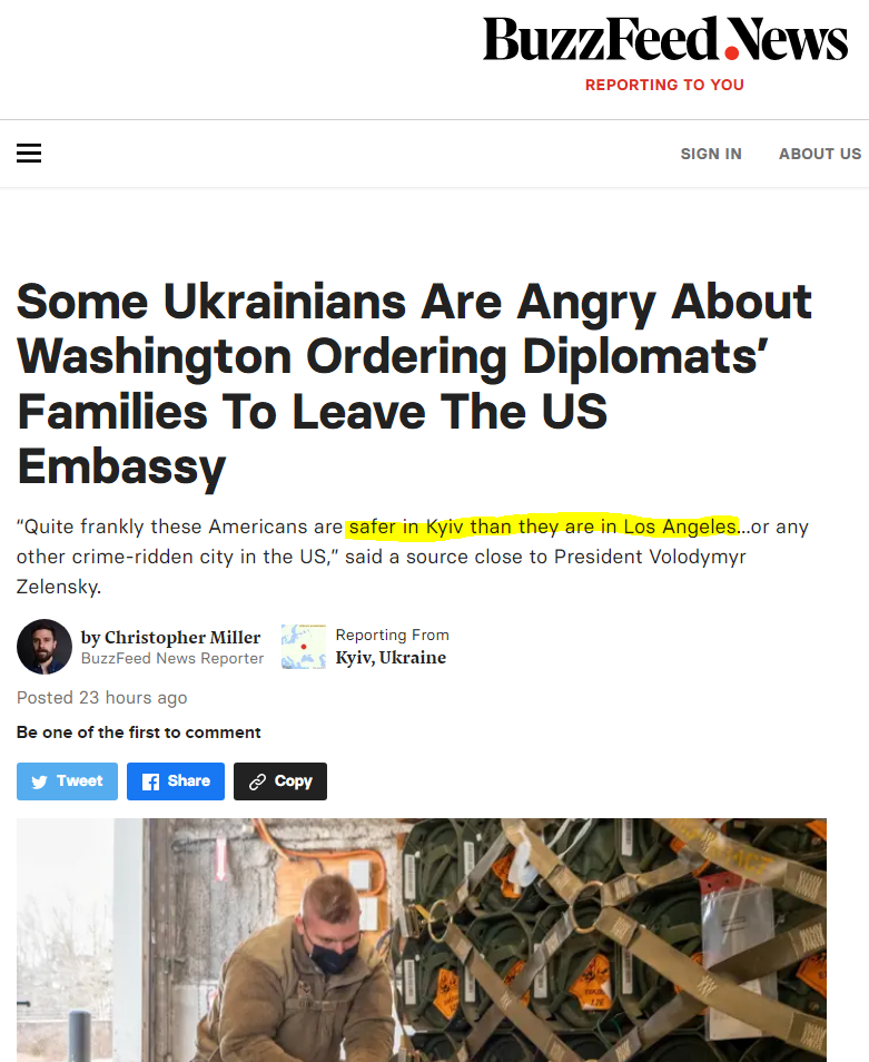 Спросили меня на днях американские ученики, будет ли война с Россией. Подростки передают то, что видят и слышат их родители, а сейчас это сплошная накачка населения в духе "русские идут! (the Russians are coming!"). Нетрудно представить себе такой диалог между двумя американцами: Куда они (русские) идут? На Америку? Нет, на Украину. А где это? Не знаю. Где-то в Европе, кажется. Примерно так обстоят дела на месте здесь в Америке. В то время как Госдеп отзывает своих дипломатов из Киева, источник, приближённый к президенту Украины, просит американцев не горячиться и говорит, что Украина сейчас безопаснее Лос-Анджелеса. И в самом деле, в нечужом нам городе количество убийств за один год возросло на 94 процента. А Чикаго? Там в прошлом году убитыми насчитали около тысячи человек. Тут всё как с великой хворью: если народ каждый день смотрит официальные СМИ или их ролики в Ютубе, то он сам позволяет корабельным новостям нагнетать страх. Если американский народ отключается от промывки м