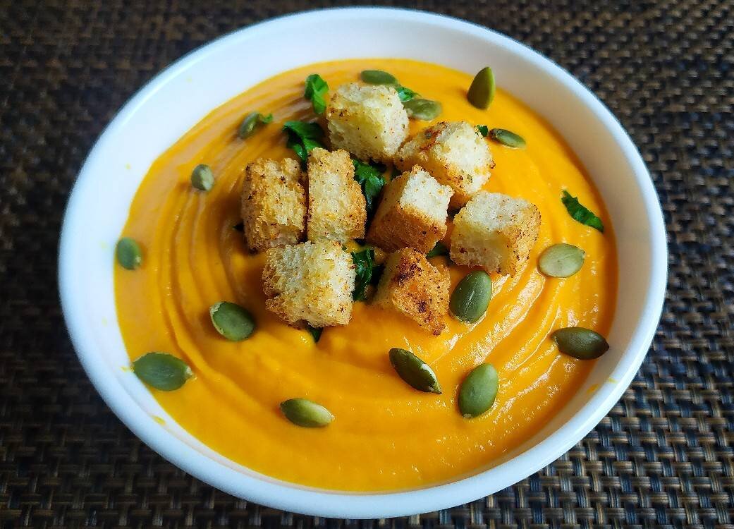 #тыква Ингредиенты: мякоти тыквы, воды или бульона, лук крупный, морковь, картофеля, зубчика чеснока, гр сливочного масла, Растительного масла, 20% сливок, Соль, перец, приправы по вкусу (10 овощей или куриный кубик бульон);, для подачи петрушка и по желанию семечки тыквы, Сухарики:, Хлеб, Прованские травы, Чеснок, Паприка, Соль, Растительное масло Способ приготовления: В кастрюлю наливаем растительное масло и к нему добавляем сливочное. Мелко режем лук и чеснок и пассеруем в этой кастрюле; Тыкву, картофель и морковь режем кубиком и добавляем в кастрюлю, помешивая минут 10 пусть томится; Вливаем воду или бульон, так, чтоб ели покрыла овощи, накрываем крышкой и оставляем на 30 минут на медленном огне до готовности овощей; Сливаем полностью воду в отдельную посуду, добавляем к овощам подогретые сливки, соль, приправы и хорошо блендерим, при необходимости добавляем слитую воду до желаемой консистенции; Хлеб для сухариков режем на кубики, поливаем немного маслом, добавляем приправы, чеснок