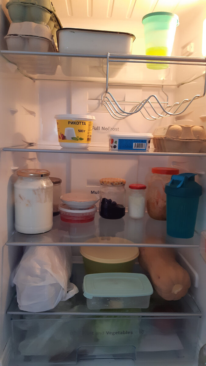 На бутерброды - банка икры минтая. Еще 1/2 пачки маргарина, банка рикотты, коробка брынзы, тыква, пекинская капуста, маленький кочан белокочанной капусты (уже половина, израсходовала на щи), яиц домашних 6 шт и еще 12 шт мелких, на приготовление блюд и выпечку, 1/3 литровой банки квашеной капусты, домашний йогурт, рыба дальневосточная копченая, маленький кусочек авокадо, сыворотка.