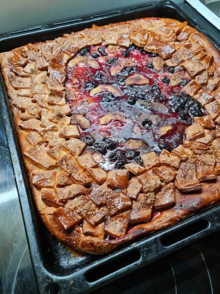#пирог Ингредиенты: Тесто:, Мука, Тёплое молоко, Сливочное масло, Сахар, Соль, Яйцо, Дрожжи сухие, Начинка:, Варенье (у меня чёрная смородина), Яблоко (по желанию), Сахар, корица , Яйцо (для смазывания), Раст.масло для смазывания противня Способ приготовления: В миске смешать дрожжи + сахар + соль + яйцо + сливочное масло + тёплое молоко. Постепенно вводим муку. Замешиваем тесто. Накрываем полотенцем и убираем в тёплое место до поднятия. (примерно на 1 час). Тесто поднялось. Делим его на 2 части. Первая часть будет низ пирога, а вторая вверх. Затем раскатываем низ пирога скалкой по форме противня. Выкладываем его в противень смазанный раст.маслом. Берём половину варенья и смазываем низ пирога. Затем сверху варенья выкладываем порезанное на дольки яблоко + посыпаем сахаром и корицей. Далее сверху выкладываем остатки варенья. Берём вторую часть теста. Раскатываем и нарезаем на квадратики. Украшаем сверху произвольно пирог квадратиками. Смазываем взбитым яйцом и посыпаем сахаром. Ставим в