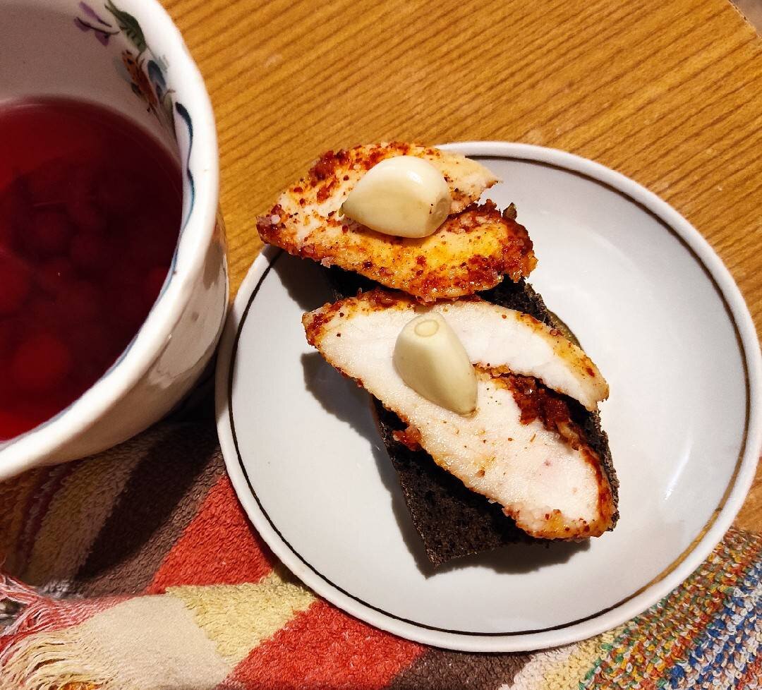 #кукпад4 Поздравляю замечательную команду Кукпад с днём Рождения 🥳 Желаю новых авторов, прекрасных рецептов, нескончаемого вдохновения, полезных блюд и больше поводов собираться всем вместе за праздничным столом!🎉🎊🎈🎆 Ингредиенты: курдюк (~600 г), соли (2 - в кастрюлю, 5 - в смесь), паприки (и/или чёрного перца), чеснока Способ приготовления: Курдюк моем и нарезаем "гармошкой". В кипящую подсоленную воду (2-3 л) кладём курдюк и варим 30 минут. Пока курдюк варится, чистим чеснок и трём его на тёрке. Добавляем к чесноку паприку и соль перемешиваем. Получается смесь. Остывший курдюк нарезаем на ломтики и обильно натираем и засыпаем смесью. Убираем настаиваться в холодильник в таре с закрытой крышкой не менее, чем на 8 часов. Потом можно хранить в морозилке. Приятного аппетита!🌈 Если вам понравился мой рецепт и вы приготовили по нему, то буду рада видеть ваши фотоотзывы ⭐