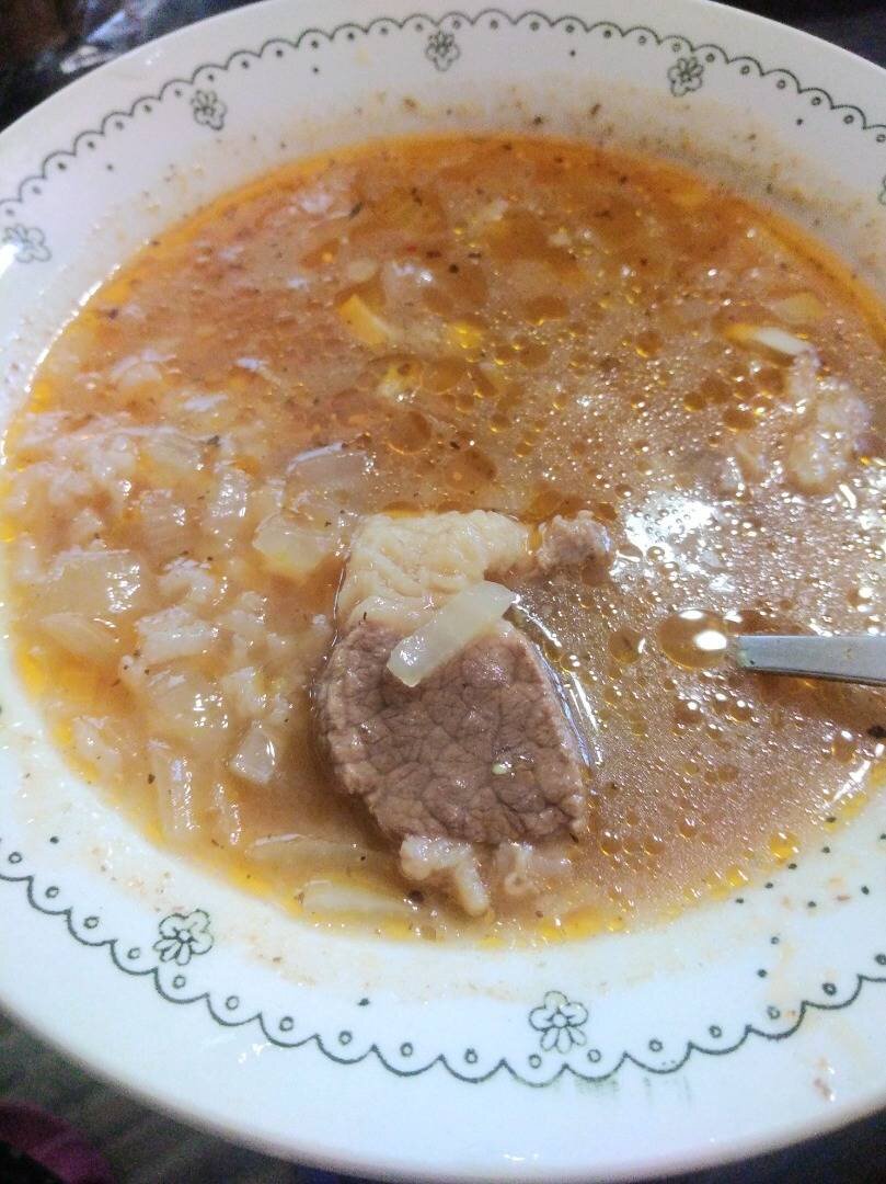 Ещё один рецепт из книги о вкусной и здоровой пище 1954 года, муж прочитал и решил приготовить. Отличный суп получился. Празднуем #кукпад4 !!! Всем здоровья и добра💕❤️👨🍳 Ингредиенты: говяжьей грудинки, луковицы, риса, кислых слив, я заменила соусом ткемали, чеснока, томата-пюре или 100 г помидоров?, Зелень для подачи, Соль и перец Способ приготовления: Мясо обмыть, нарезать небольшими кусками, по 3-4 на порцию, положить в 2,5 л кастрюлю, залить холодной водой и поставить варить. Пену удалять шумовкой. Мы сварили бульон заранее. Через 1,5-2 часа положить мелко нарезанный лук, толченых чеснок, рис, соус Ткемали, соль, перец и варить ещё 30 минут. Томат слегка поджарить на масле или жире, снятом с бульона и добавить в суп за 5-10 минут до окончания варки. При подаче можно добавить зелень и сметану. Говяжью грудинку можно заменить бараньей.