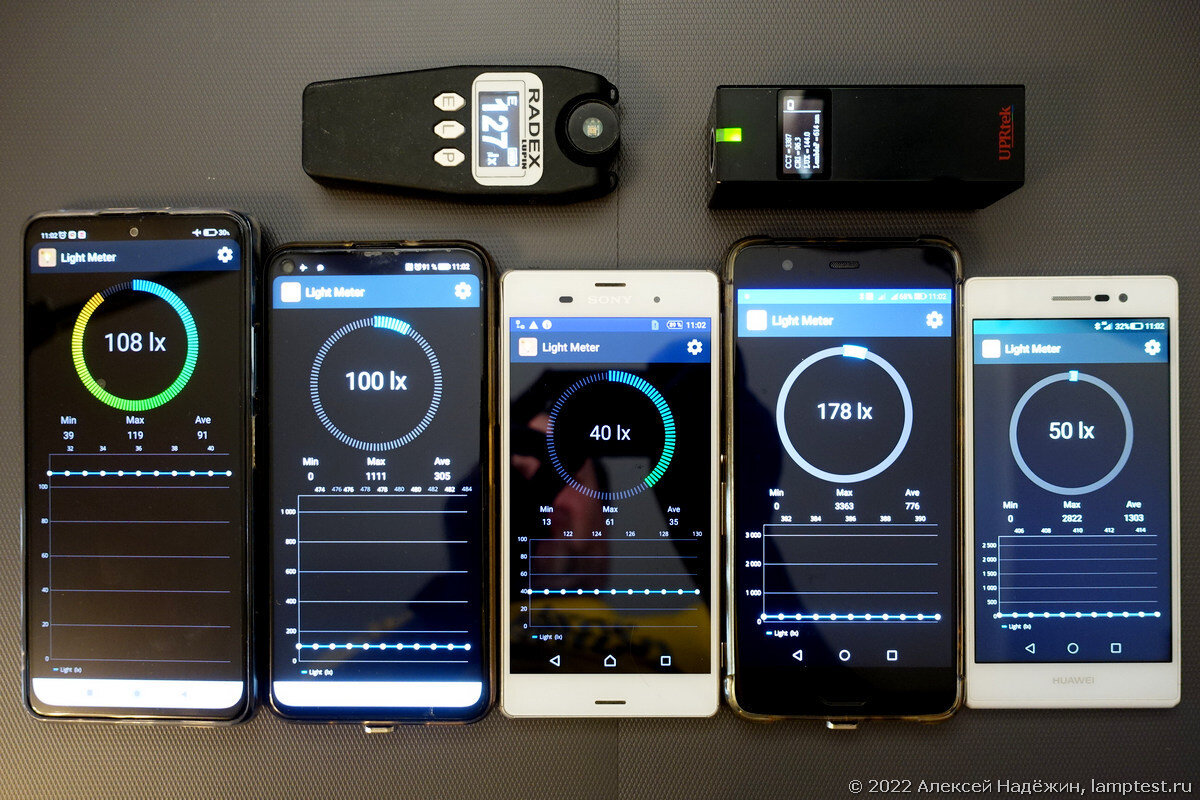 Я проверил точность работы датчиков освещённости в пяти смартфонах. На все смартфоны было установлено приложение Light Meter. Показания смартфонов сравнивались с показаниями спектрометра Uprtek MK350D и люксметра-пульсметра Radex Lupin. Заодно я проверил результаты датчиков BH1750 и TSL2561, подключённых к Arduino. В качестве источника света я использовал светильник Gauss 2020122 с матовым рассеивателем, управляемый по Wi-Fi. Светильник располагался над столом, в приложении менялась его яркость. Датчики смартфонов и всех приборов располагались в одной точке на одной высоте. Первое измерение сделано при фоновом освещении от люстры в комнате, остальные четыре на четырёх яркостях светильника от минимальной до максимальной. Как видно из таблицы, результаты датчика BH1750 и спектрометра MK350D оказались достаточно близки и я думаю спектрометр и этот датчик