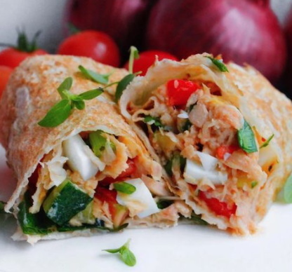 Овощи и яйцо мелко порезать. Зелень измельчить и смешать с маслом. Все смешать. Выложить начинку на лаваш и скрутить ролл.