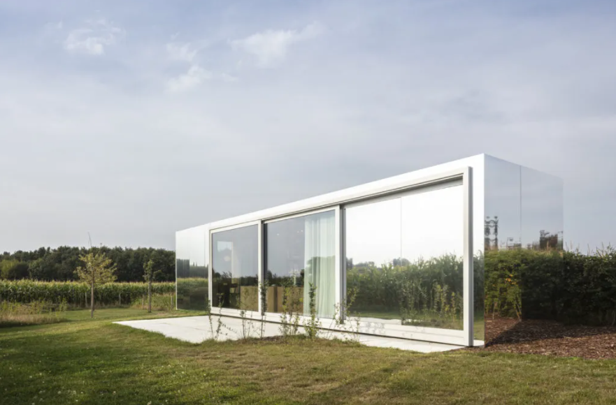 Архитектурная студия TOOP Architectuur решила использовать транспортные контейнеры для двух новых офисов, которые они планируют построить в Бельгии. Офис, построенный в Вестаутере, Бельгия, был покрыт зеркальными алюминиевыми панелями, чтобы скрыться в ландшафте. Здание имеет название «архитектурной лаборатории». · Архитекторы : TOOP architectuur · Контейнеры : 1 х 40 футов · Площадь : 36 м² · Год : 2019 · Местонахождение : Вестутер, Бельгия · Фотографии : Тим Ван Де Вельде