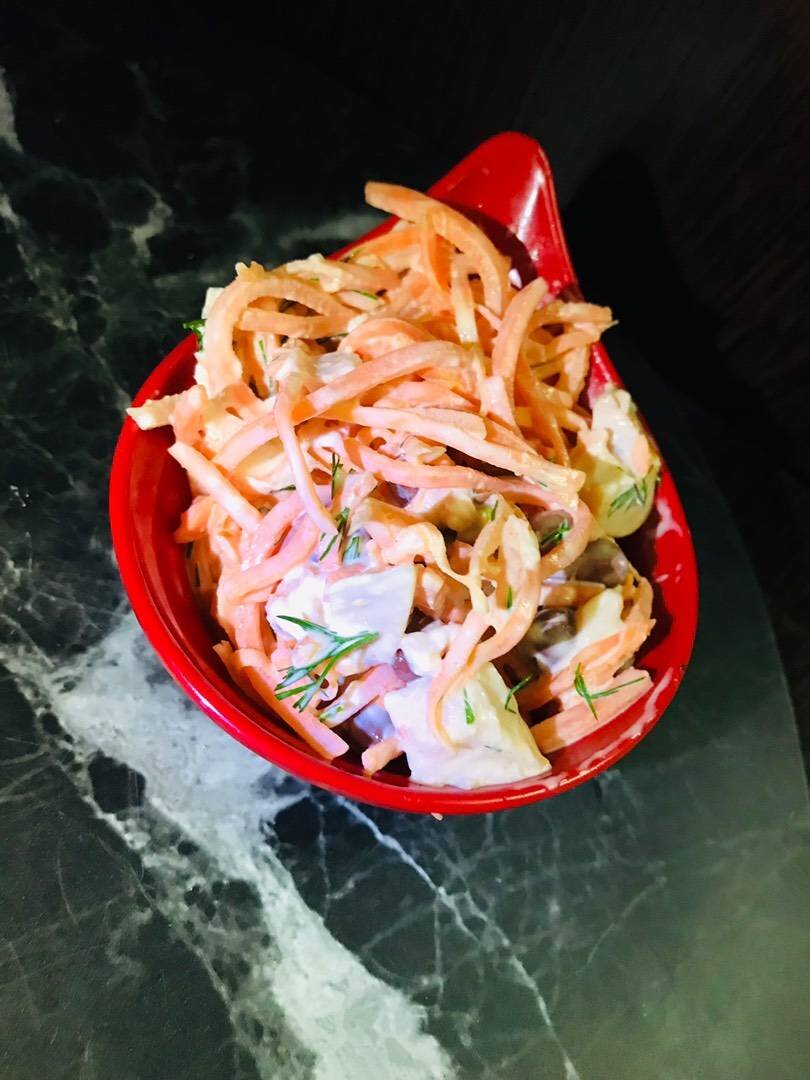 Отличный завтрак и как закуска на стол.) Ингредиенты: Куриное филе , Фасоль красная отварная (можно консервированную), Корейская морковь 🥕 , Зелень, соль , Майонез Способ приготовления: Куриное филе отварить и порезать на мелкие кубики; Фасоль отварить и выложить в салатник; Морковь по-корейски также выложить в салатник; Зелень порезать, посолить и заправить майонезом. Bon appetite 😘