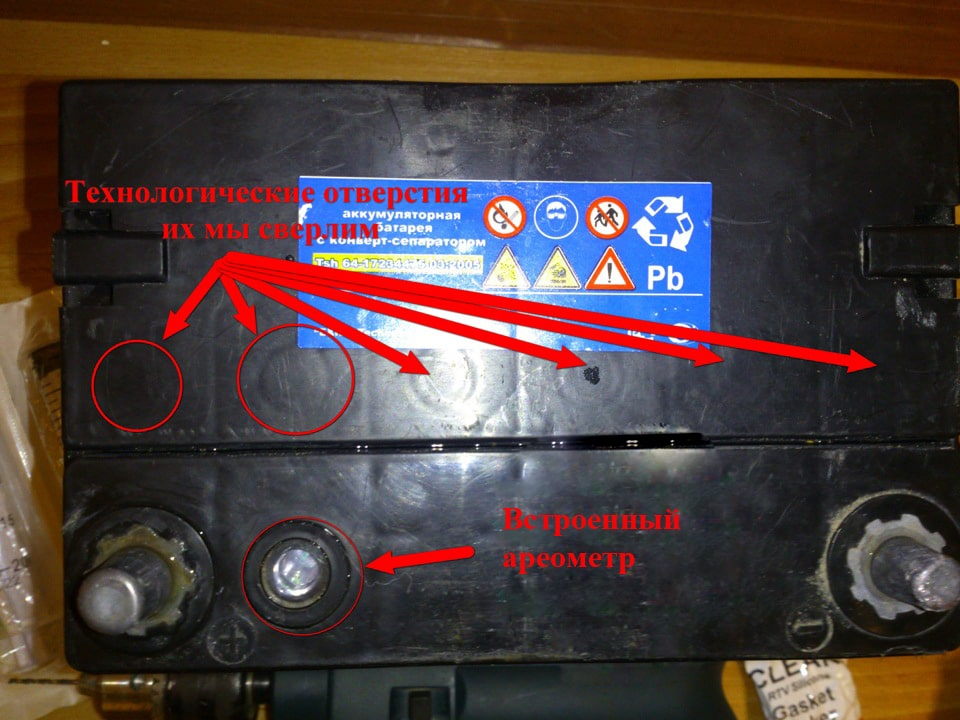Если батарея быстро садится, то велика вероятность, что уровень электролита в ней мал. Это, конечно, тоже не сто процентов – возможно, что пластины в батарее засульфатировались или вообще развалились. Но попытка – не пытка, поскольку всё равно аккумулятором пользоваться невозможно. Поможет – хорошо. Нет – хуже не будет. Прежде всего необходимо определить места на крышке, где будем сверлить, чтобы не просверлить газоотводные каналы. Сделать это несложно – и каналы и места технологических отверстий хорошо просматриваются на крышке. Берём дрель со сверлом диаметром 5 мм и аккуратно высверливаем отверстия. Сверлим без фанатизма, чтобы не пробуравить пластины. Такой диаметр отверстий выбран для того, чтобы замерить уровень электролита и его плотность можно было обычным автомобильным ареометром. Теперь делаем всё то же, что делали бы с обычной обслуживаемой. Берём ареометр и замеряем уровень электролита во всех банках. Он должен быть выше пластин примерно на 10 мм. При необхо