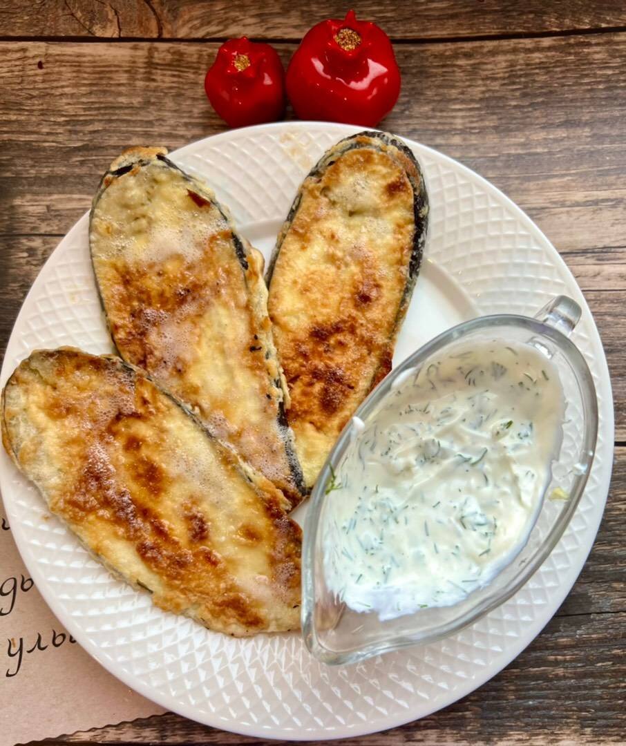 Ингредиенты: баклажан, муки, яйцо, соль , оливковое масло, Соус, сметаны, зелени (укроп, зелёный лук), чеснока, соль Способ приготовления: Для соуса смешиваем все ингредиенты и даём настояться. Баклажан разрезаем вдоль слайсами толщиной 0,5 см. Вилкой взбиваем яйцо в одной мисочке. В другую высыпаем муку. Окунаем баклажан в муку, потому яйцо и снова обваливаем в муке. Обжариваем на разогретой сковороде с оливковым маслом с двух сторон до готовности. Подаём с соусом. Приятного аппетита!