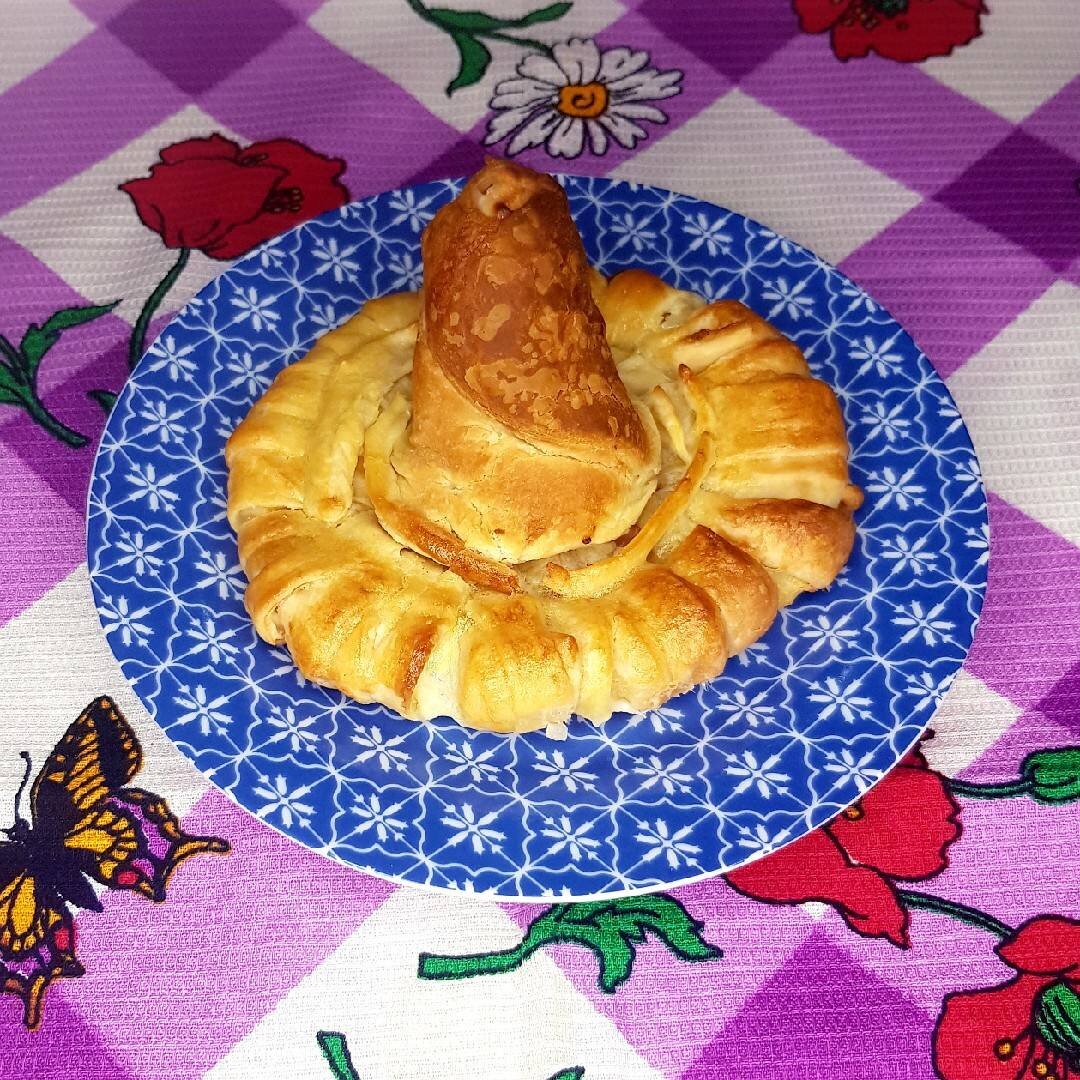 Этот рецепт я увидела в интернете. Мне он понравился, и я захотела его приготовить. К сожалению, я не знаю названия блюда, поэтому придумала сама. Получилось очень необычно, интересно и вкусно! Попробуйте... Вы не пожалеете. Ингредиенты: Слоёного теста, Сыра Сулугуни, Грибов опят, Колбаса балыковая, Масла растительного, Сметанного соуса, Лука, Яйцо, Соль Способ приготовления: Раскатать тонко тесто, вырезать при помощи тарелки из него круг, разделитьего на две части. Из фольги сделать два кулька. Для плотности заполнить эти кульки фольгой. Теперь кладём кулёк на половину круга из теста и обматываем кулёк тестом. Лишнюю фольгу сверху обрезаем. Оставшееся тесто нарезаем полосками. Далее берём Сулугуни и вырезаем из него два круга толщиной примерно 0,7 мм. Вырезаем при помощи небольшого круглого предмета середины у сыра, откладываем на тарелку: они нам ещё пригодятся. Полосками аккуратно плотно, чтобы не было видно сыра, обматываем сыр через середину. Получается как бы юбочка. Затем ставим