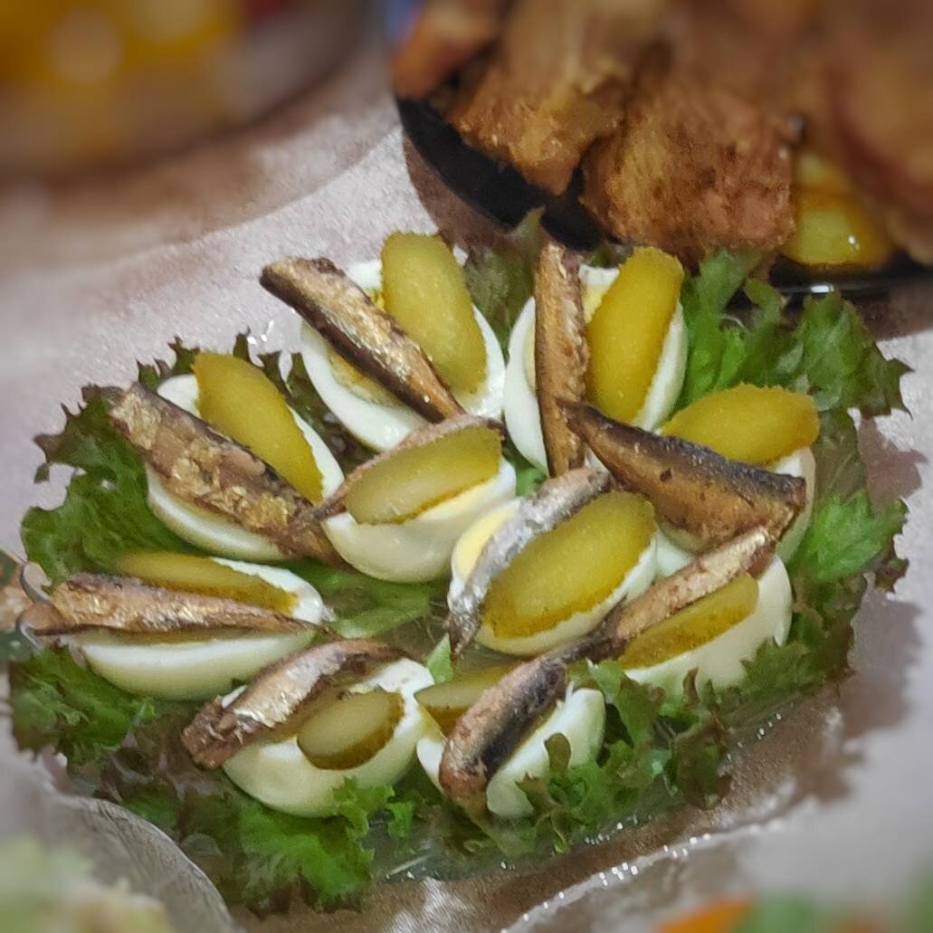 Продолжаем поздравлять любимый кулинарный сайт Cookpad с днём рождения🥳! Предполагалось на праздничный стол другое блюдо (от слова "совсем"). Но.. как сложилось😄. Можно и на завтрак ☕. #кукпад4 #завтрак Ингредиенты: Яйца, Шпроты, Маринованный огурец, Листья салата Способ приготовления: Яйца предварительно отварить и остудить. Почистить. На плоское блюдо выложить листья салата. Сверху половинки яиц. На яйца по рыбке и кусочку маринованного огурца. Приятного аппетита😍! Если вам по душе мои незатейливые рецепты: подписывайтесь и оставляйте свои фотоотзывы📸!