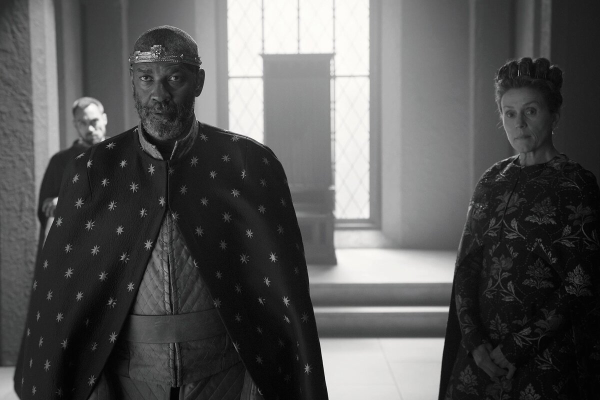 Автор: Ирина Жигмунд Режиссер Джоэл Коэн хотел, чтобы его экранизация шекспировской пьесы об амбициозном шотландском короле, сохраняла театральность, но при этом, не выглядела, как снятая на пленку пьеса. Он решил снимать в стиле классического черно-белого экспрессионистического кино. В фильме много красивых ракурсов, графических линий и сюрреалистических отсылок. Поскольку фильм "Трагедия Макбета" - черно-белый, то художник по костюмам Мэри Зофрес в своей работе больше полагалась на фактуры, чем на цвет. По мере восхождения Макбета «мы в костюмах переходим к светоотражающим материалам, имеющим блеск», - объясняет она. Например, королевская накидка, повторяющая один из кадров ночного неба, снятого оператором Бруно Дельбоннелем, усеяна блестящими звездами. Эту ткань им предоставил Дом мод «Валентино», чей креативный директор Пьерпаоло Пиччоли является другом Фрэнсис МакДорманд. Зофрес также использовала и цвет, хотя может показаться, что в черно-белом фильме это не имеет особого значен