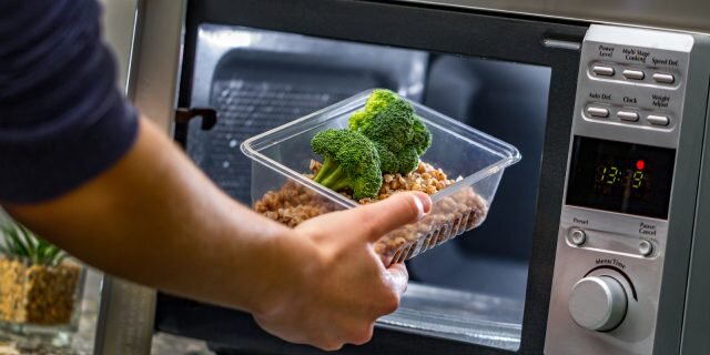 - Пластиковая посуда.Она вызывает больше всего споров. Есть опасения, что даже при нагревании тех видов пластика, которые одобрены для использования в микроволновке, выделяются канцерогенные вещества. Хотя учёные утверждают , что вред от хранения продуктов в пластиковой таре несущественный, лучше перестраховаться и разогревать еду в стеклянной посуде. И точно не стоит ставить в микроволновку старые деформировавшиеся или потрескавшиеся пластиковые контейнеры.