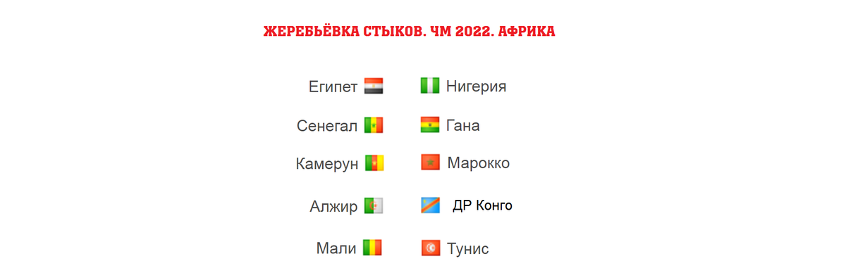 Состоялась жеребьевка стыков на чемпионат мира в Африке. В финальный раунд пробилась сборная Египта и Нигерии, Сенегала и Ганы, Камеруна и Марокко, Алжира и Демократической Республики Конго, Мали и Туниса. Все сборные выиграли свои группы в предыдущем раунде. Сборные не виделись с 2014 года. У Сенегала сейчас 10-матчевая беспроигрышная серия. Любят эти сборные счёт 4:1, по крайней мере, Гана 3 раза побеждала Нигерию с таким счетом, в том числе в последней игре 2017 года. Последняя встреча была в 2017 году. Камерун одержал победу в отборе на чемпионат 2018 года. Демократическая Республика Конго один раз участвовала на чемпионатах мира под названием Заир. Команды сыграли последний матч недавно в январе 2022 на Кубке Африке. Сборная Мали одержала минимальную победу в группе. В Катар отправятся 5 победителей стыковых матчей. ---------------------- Напомню, что в 2018 году Африку представлял Египет, Сенегал, Нигерия, Марокко и Тунис. Кого вы хотите увидеть на чемпионате мира? Мне осталось с
