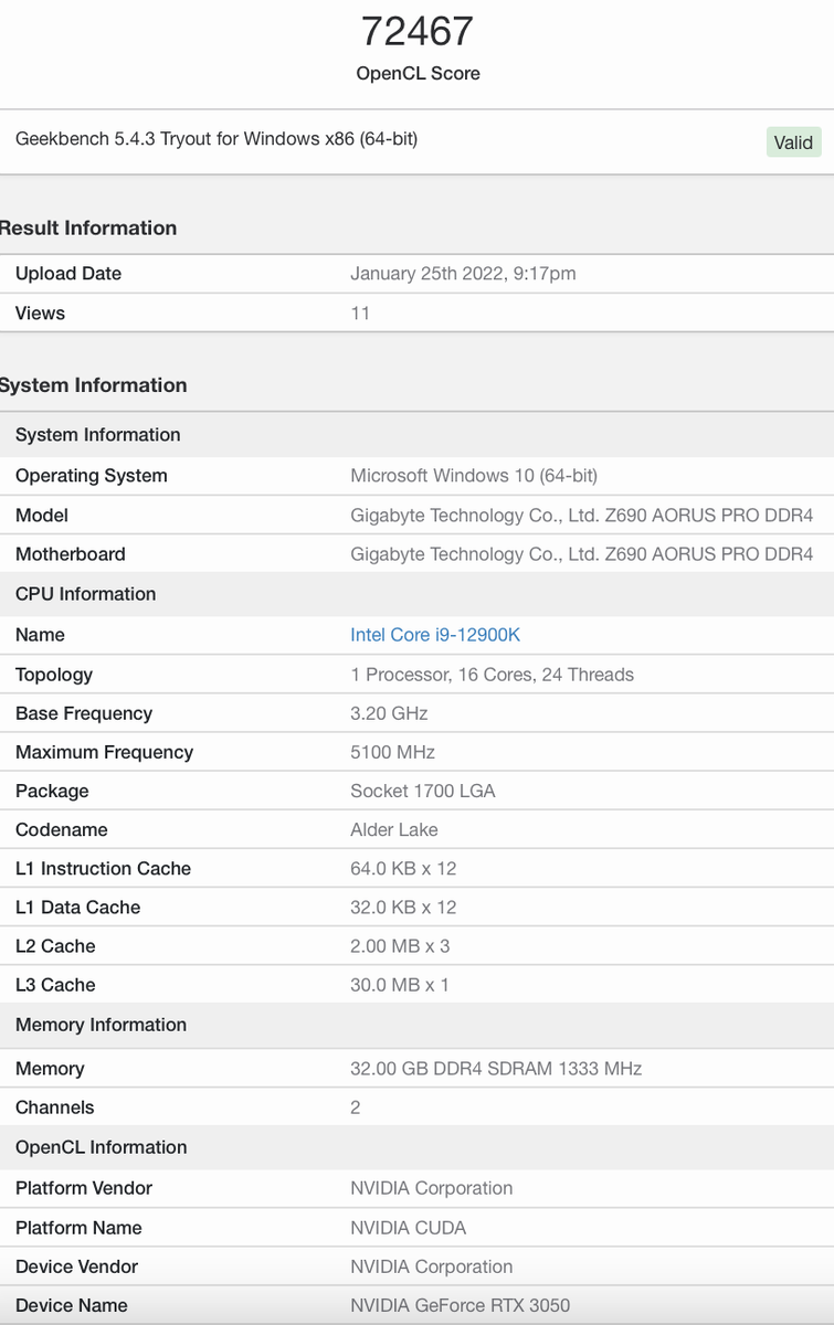 Опубликованные вчера данные говорили о том, что GeForce RTX 3050 быстрее конкурентной видеокарты Radeon RX 6600 в играх, но заметно медленнее в бенчмарке 3DMark. Что ж, сейчас новинку Nvidia протестировали в другом бенчмарке, Geekbench, и тут у 3D-карты AMD уже нет существенного преимущества. GeForce RTX 3050 набрала в тесте OpenCL 72 467 баллов, и это больше, чем у GeForce GTX 1660 Super – ближайшей 3D-карты Nvidia со сходной ценой и производительностью. Она набирает в тесте Open CL около 71 000 баллов. GeForce RTX 2060 тоже позади – у нее 70 500 баллов. Что касается Radeon RX 6600, то она впереди, но совсем ненамного – на ее счету 73 184 балла. Напомним, продажи GeForce RTX 3050 стартуют завтра, а сегодня ближе к вечеру будут опубликованы первые обстоятельные тесты новинки.