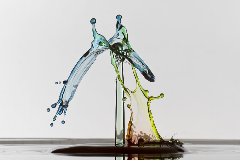 Для подобной задачи нам понадобится комплект для съемки капель воды, два дополнительных комплекта водяного клапана и сифоны Mariotte. Я также использовал три монтажных кронштейна, чтобы облегчить регулировку клапанов. Настройка упростится, если сифоны отсоединить от водяных клапанов. Для этого я использовал три комплекта расширения сифонов. Еще понадобится кабель RCA Y для подключения клапанов 2 и 3. Для фотографии в начале статьи, водяной клапан с красной водой был подключен к выходу Trigger 1, с синей и желтой - к триггеру 2, а вспышки - к Trigger 3. Камера находилась в режиме Bulb с диафрагмой, установленной на f/16. Конкретно в этом снимке я использовал две вспышки Yongnuo YN-560 в ручном режиме с минимальной мощностью. Вспышки срабатывали параллельно с помощью кабеля RCA Y и двух адаптеров RCA на PC.