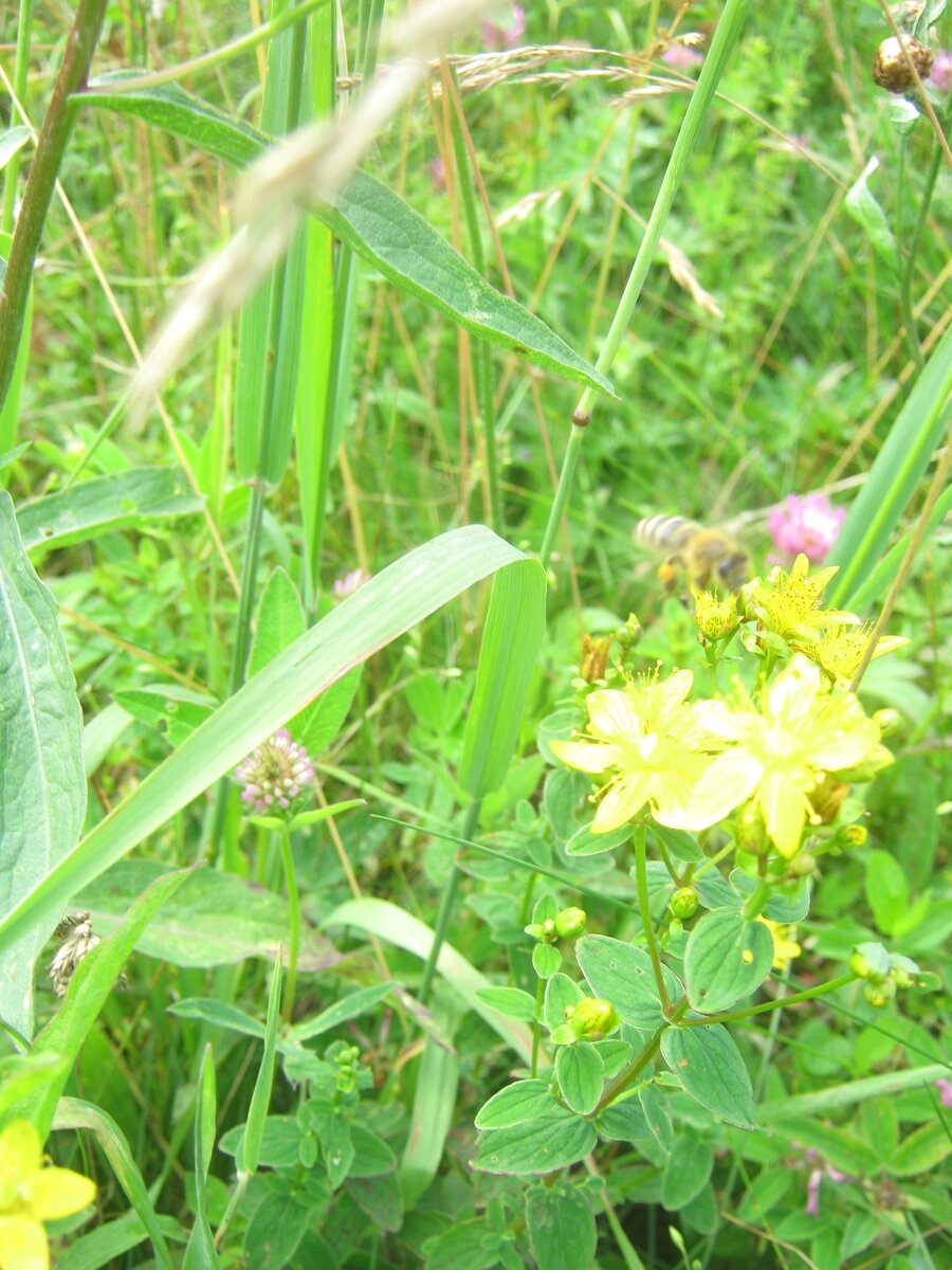 Даже подумал: а не назвать ли свой мед так? Вот и фото-подтверждение есть. Да, у зверобоя есть нектарники, и в определенных условиях он может немного выделять нектар. Но, в медоносах он не числится и пчелы на нем работают лишь иногда, в пасмурную погоду, когда основные пыльценосы не доступны. Именно пыльца привлекает на него пчел, и то в исключительных случаях, когда нормальную не найти.