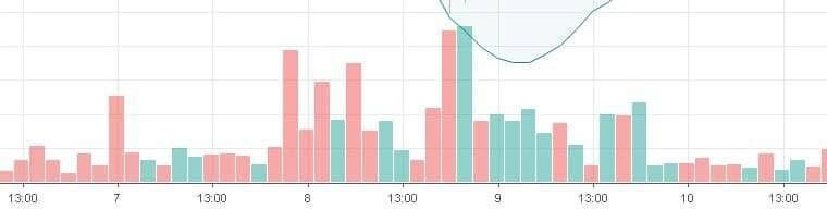 В расчетах индикатора используется количество осуществляемых сделок за определенный период времени, который выставляется вручную пользователем. В 99% случаев индикатор размещается прямо под главным графиком и это очень сильно упрощает тех.анализ, поскольку четко и ясно показывается, как объем сделок растет или падает. Этот индикатор рисует столбики разной высоты под ценовым графиком и закрашивает их в зеленый или красный цвет, в соответствии с цветом свечи, под которой он находится. Чем выше столбик, тем больше трейдеры совершили покупок/продаж в данный промежуток времени. Еще раз напомним: в расчетах учитывается количество сделок, а не их сумма!