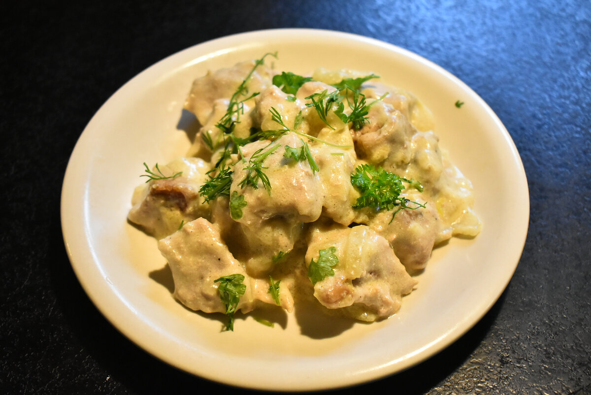Решила сегодня на обед приготовить в качестве гарнира картофельное пюре. Но какое же пюре без мяса, по этому я сегодня готовлю свинину в сметанном соусе. Мясо по этому рецепту получается очень нежным и сочным. Это блюдо можно готовить как на праздник, так и на каждый день. Обязательно советую приготовить это блюдо! 👨🍳 Давайте уже готовить свинину в сметанном соусе! Список продуктов я оставлю в конце статьи, для Вашего удобства. 500 г свинины нарезаем кубиками. Отправляем свинину на раскаленную сковороду с растительным маслом. Слегка обжариваем, время от времени помешивая. Два репчатых лука крупно нарезаем. Отправляем лук на сковороду к мясу. Солим, перчим по вкусу. Перемешиваем и обжариваем лук с мясом, пока лук не приобретет золотистый цвет. Две столовые ложки муки добавляем к мясу. Перемешиваем. Вливаем 1,5 стакана воды. Добавляем 5 столовых ложек сметаны и 1 чайную ложку горчицы. Перемешиваем и тушим на небольшом огне еще примерно 20 минут. Подаем с любым гарниром. Приятного апп