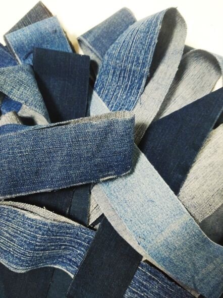 Куда деть старые джинсы? - такой вопрос у меня не стоит. В голове много идей, но время не всегда есть воплотить эти самые идеи. Но я потихоньку занимаюсь переработкой и перевоплощением старой джинсы во что-то новое, красивое и нужное. Вот я и добралась до ванной комнаты. Хочу в ванную сшить небольшой коврик из джинсовых полос, и сошью! У меня ванная комната как раз в сине-голубых тонах. У меня некоторые джинсы уже разрезаны, я с ними успела немного поработать. Выбираю лоскуты подходящей мне длины, это примерно 62-63 см. Выкраиваю полосы шириной 5 см. Два сантиметра (по 1 см. на шов) уйдет на швы и в готовом виде полосы будут 3 см. Чтобы коврик смотрелся красиво и интересно я вырезаю полосы из джинсы разных цветов и тонов (от голубого до темно-синего). Обратную сторону коврика я буду шить то же из джинсовых лоскутов. Другой ткани подходящего размера у меня нет, да и из джинсы коврик будет поплотней. Обратная сторона коврика будет стачная из трех частей. Подобранные подходящего размера